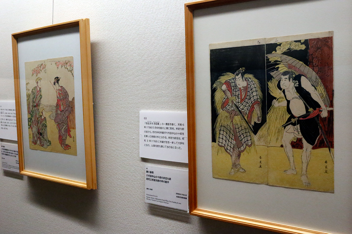 (左から)勝川春好《三代目吾妻藤蔵のあづまのもの楠の千枝きつね 初代大谷徳次の狩人田のくろの山助 三代目市川高麗蔵の狩人なるこの万助》太田記念美術館 / 勝川春英《六代目中山小十郎の斧定九郎 初代三枡徳次郎の早の勘平》太田記念美術館