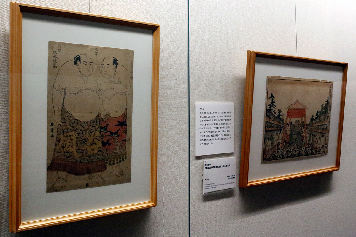 (左から)勝川春章《西方 前頭仙台 宮城野錦之助 大関仙台 谷風梶之助》太田記念美術館寄託 石黒コレクション / 勝川春章《江都勧進大相撲浮絵土俵入後正面之図》太田記念美術館