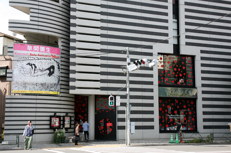 ワタリウム美術館。ガラス面は草間彌生展らしく水玉仕様になっています。