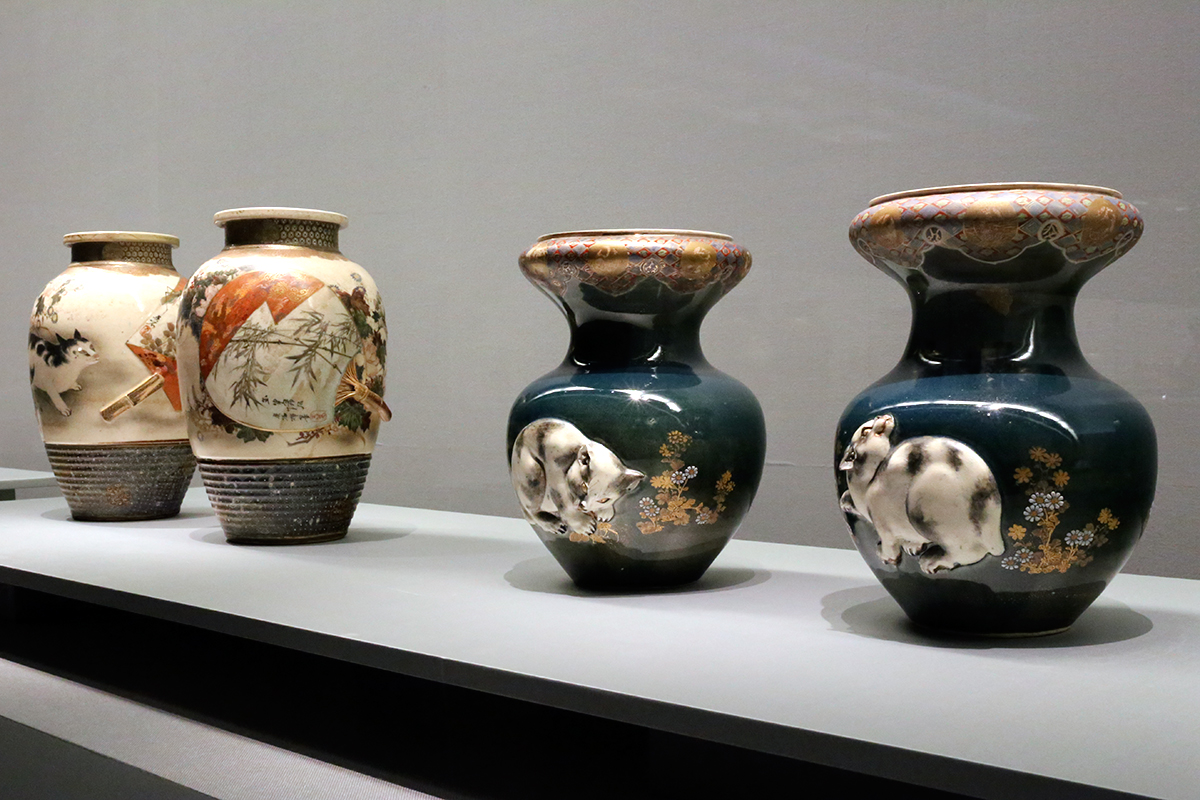 (左から)《高浮彫猫ニ団扇花瓶》 / 《瑠璃釉高浮彫猫花瓶》 ともに田邊哲人コレクション