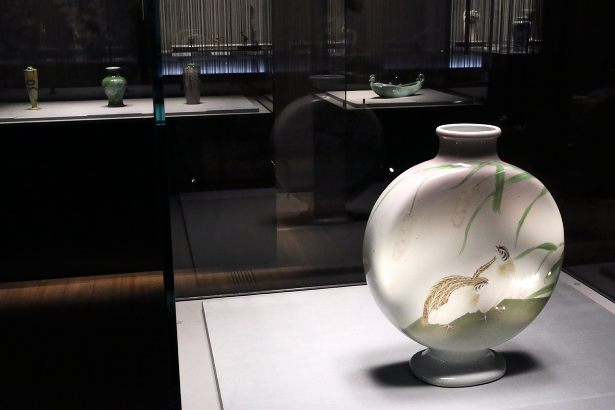 (右手前)《釉下彩盛絵粟ニ鶉図扁壺》田邊哲人コレクション