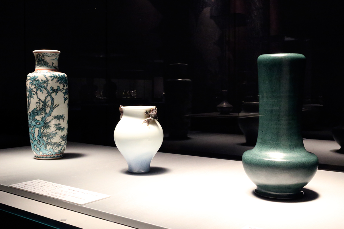 (左から)《珠翠釉花鳥図花瓶》田邊哲人コレクション / 《青華釉裏紅青海波文魚耳付花瓶》田邊哲人コレクション / 《琅玕釉花瓶》石川県立美術館
