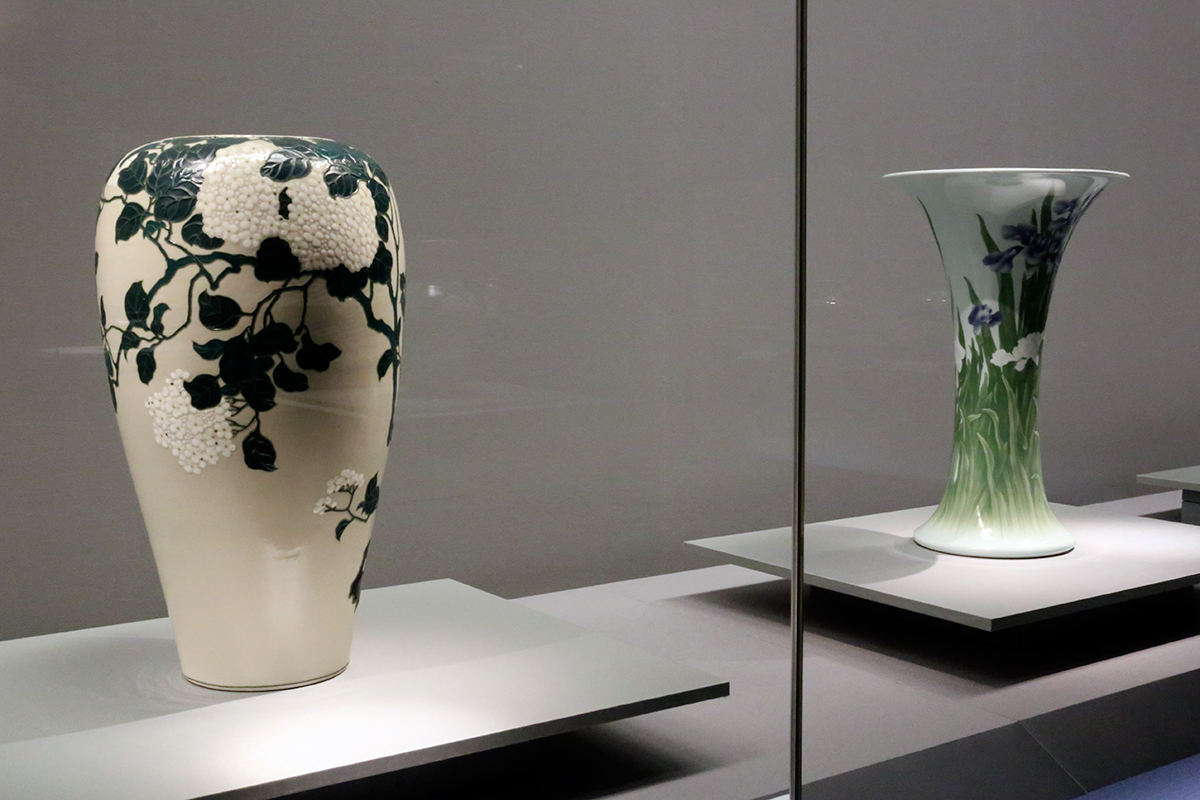 (左から)《色嵌釉紫陽花図花瓶》田邊哲人コレクション(神奈川県立歴史博物館寄託) / 《釉下彩菖蒲図大花瓶》東京国立近代美術館
