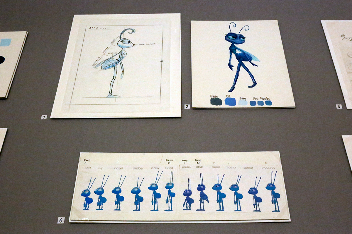 「バグズ・ライフ」のキャラクター (下から時計回りで)ティア・W・クラッター《種々のアリのキャラクター》 / ボブ・ポーリー《アッタ姫のモデルパケット》 / ティア・W・クラッター《アッタ姫のシェーダー・ペインティング》