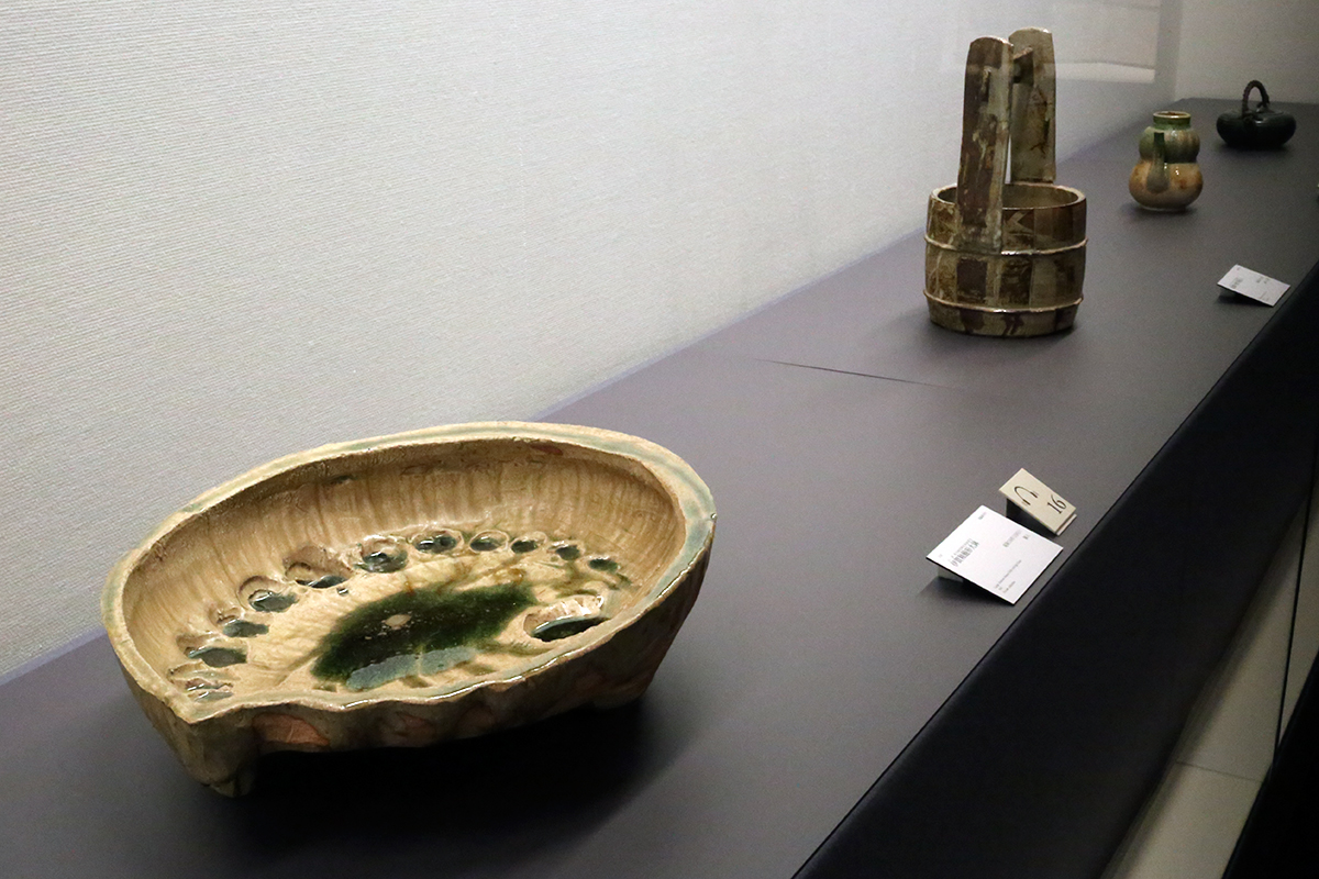 (左から)《伊賀釉鮑形大鉢》昭和16年(1941) 個人蔵 / 《絵瀬戸風手桶花入》昭和25年(1950) 銀座 久兵衛 / 《織部瓢形水入》昭和15年(1940)頃 足立美術館 / 《織部土瓶》昭和2年(1927)頃 個人蔵