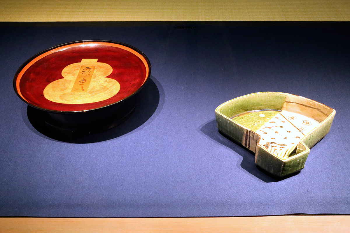 (左から)《漆膳「露堂々」》2客 昭和12年(1937) 個人蔵 / 《織部扇面形鉢》昭和15年(1940)頃 足立美術館