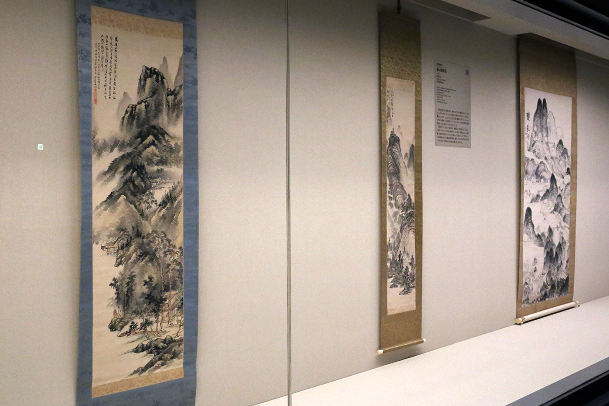 (左から)重要美術品《春山閑居図》岡田半江 天保13年(1842) / 《新緑帯雨図》青木木米 文政9年(1826) / 重要文化財《雙峯挿雲図》浦上玉堂 江戸時代
