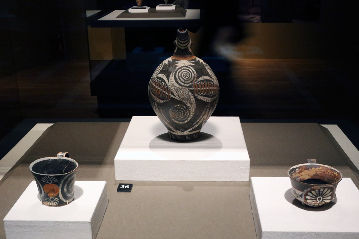 (左から)《カマレス式杯》前1750~前1700年頃(中期ミノスⅡB期) / 《カマレス式嘴形注口水差し》前1750~前1700年頃(中期ミノスⅡB期) / 《カマレス式杯》前1750~前1700年頃(中期ミノスⅡB期) すべてイラクリオン考古学博物館蔵