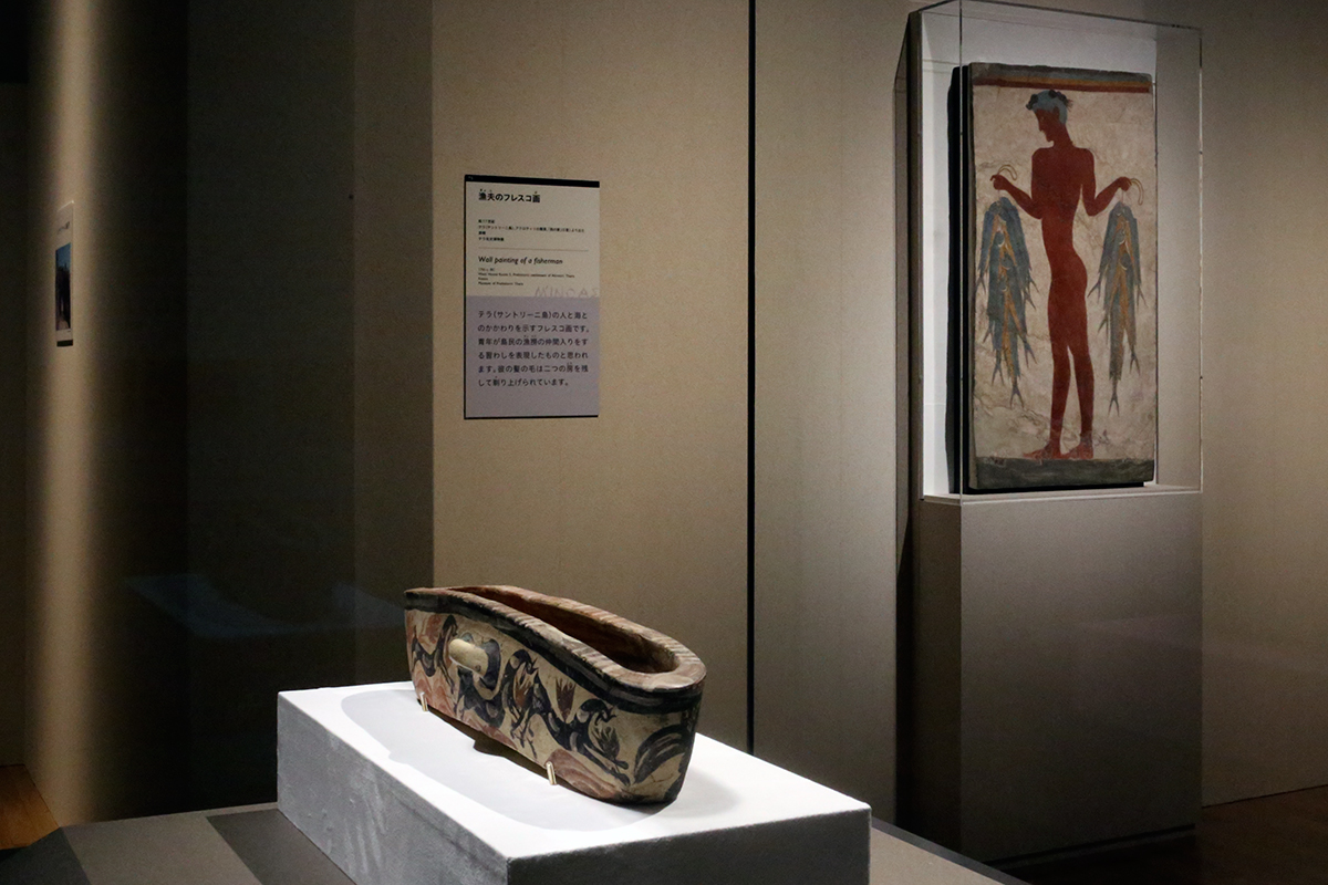 (左から)《イルカと野山羊を表わした舟形容器》前17世紀 テラ先史博物館蔵 / 《漁夫のフレスコ画》前17世紀 テラ先史博物館蔵