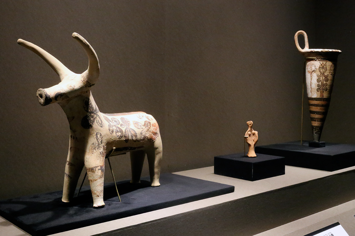 (左から)《牡牛小像》前14世紀半ば(後期ヘラディックⅢA2期) メロス考古学博物館蔵 / 《子どもを抱く女性小像》前1400年頃(後期ヘラディックⅢA期) アテネ国立考古学博物館蔵 / 《リュトン》前1300~前1200年頃(後期ヘラディックⅢB期) アテネ国立考古学博物館蔵