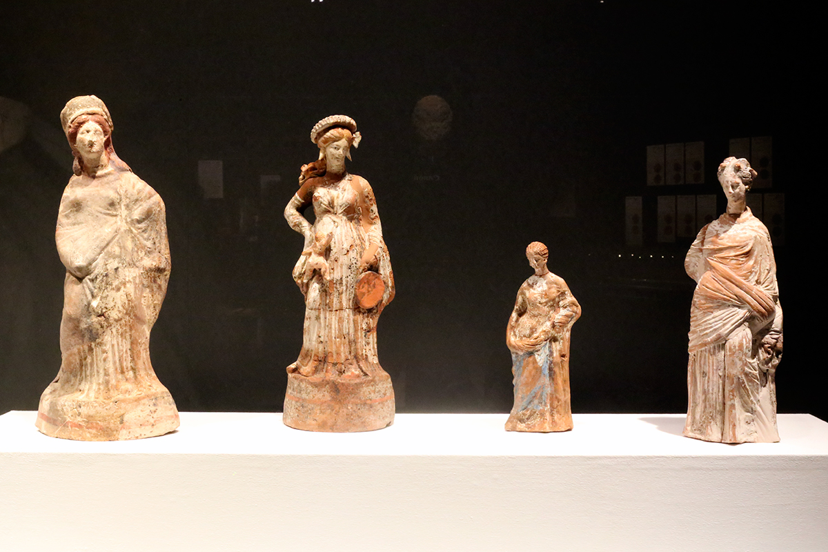 (左から)《女性小像》前3世紀後半~前2世紀初め / 《エロスを伴うアフロディテ像》前2世紀半ば / 《女性小像》前3世紀後半~前2世紀初め / 《女性小像》前3世紀後半~前2世紀初め すべてペラ考古学博物館蔵
