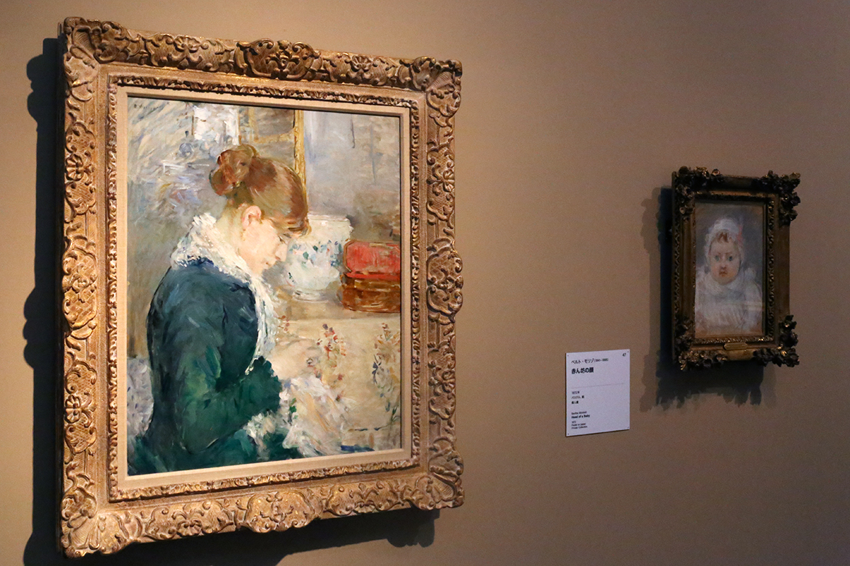(左から)ベルト・モリゾ《縫い物をする女性》1879年頃 オルブライト=ノックス美術館蔵 / ベルト・モリゾ《赤ん坊の顔》1872年 個人蔵