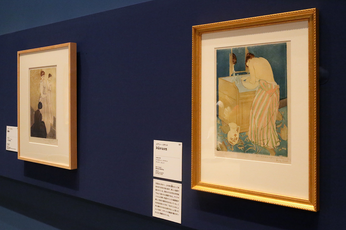 女性の日常生活を描いた10点組は、近代版画の傑作として知られる名品。浮世絵の「揃物」に倣って、このスタイルを採用したと思われます。会場には浮世絵をはじめ、カサットが愛した日本美術も展示。作品のイメージソースになった浮世絵も紹介されています。