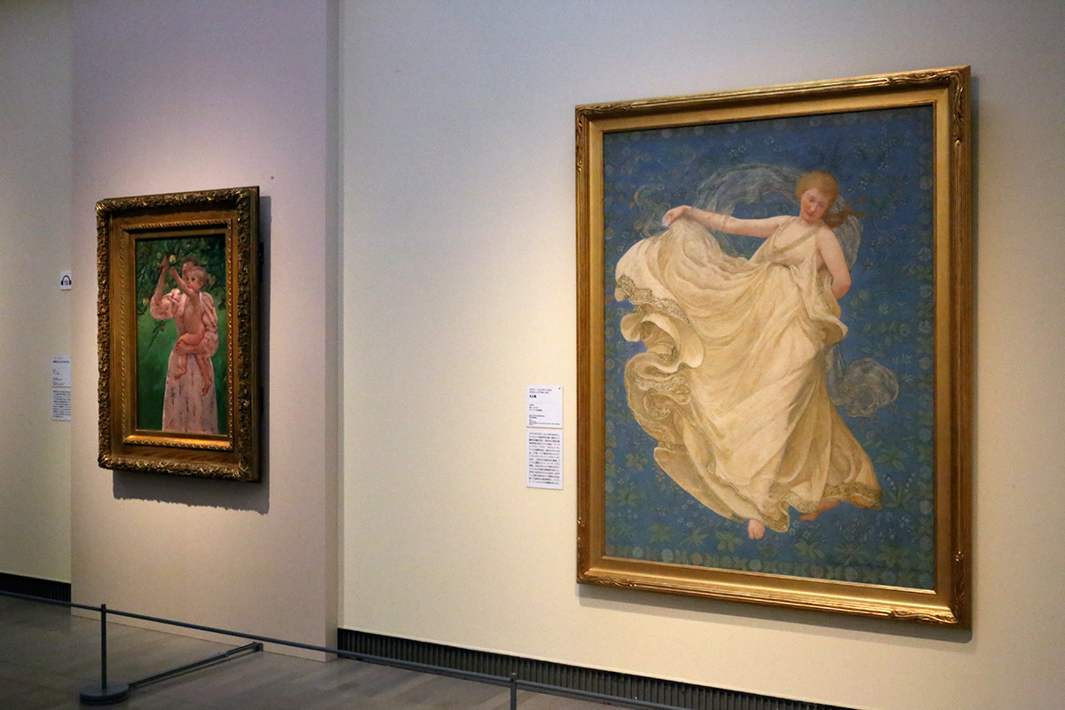 (左から)メアリー・カサット《果実をとろうとする子ども》1893年 ヴァージニア美術館蔵 / メアリー・フェアチャイルド・マクモニーズ《そよ風》1895年 テラ・アメリカ美術基金蔵