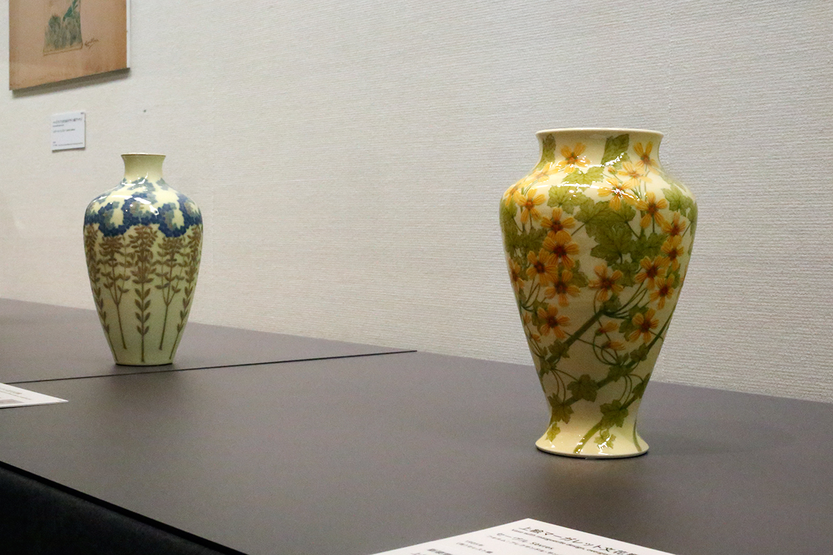 (左奥から)セーヴル《パツィオパット花文花瓶》1908年 個人蔵 / セーヴル《上絵マーガレット文花瓶》1905年 (有)セレスト