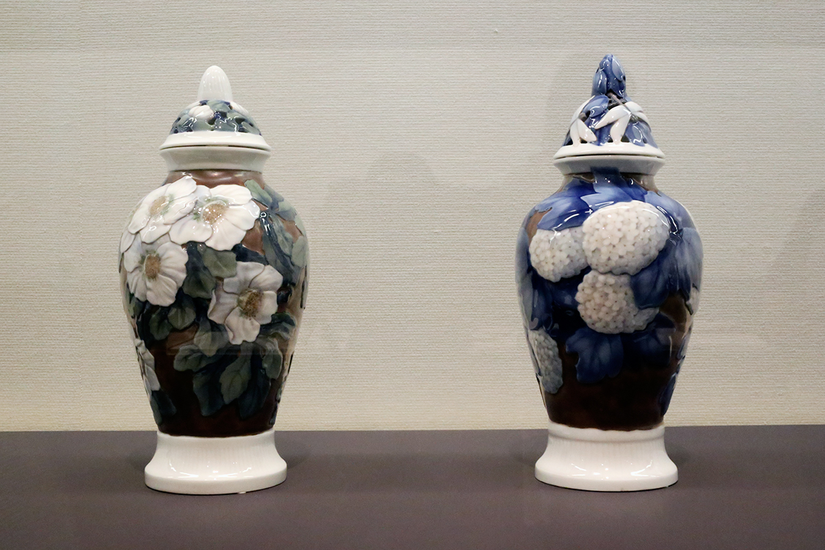 (左から)ビング&グレンダール《釉下彩クリスマスローズ文ポプリポット》1914年 塩川コレクション / ビング&グレンダール《釉下彩紫陽花文ポプリポット》1913年 塩川コレクション