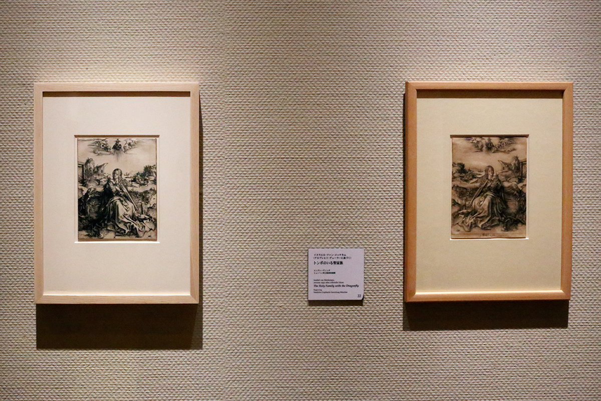 (左から)アルブレヒト・デューラー《トンボのいる聖家族》1495年頃 国立西洋美術館 / イスラエル・ファン・メッケネム《(アルブレヒト・デューラーに基づく)トンボのいる聖家族》 エングレーヴィング ミュンヘン州立版画素描館 ©Staatliche Graphische Sammlung München