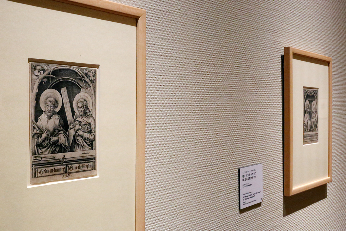 (左から)イスラエル・ファン・メッケネム《聖ペテロと聖アンデレ(〈十二使徒〉より)》 エングレーヴィング ミュンヘン州立版画素描館 ©Staatliche Graphische Sammlung München / イスラエル・ファン・メッケネム《聖トマスと小ヤコブ(あるいは聖タダイ?)(〈十二使徒〉より)》 エングレーヴィング ミュンヘン州立版画素描館 ©Staatliche Graphische Sammlung München