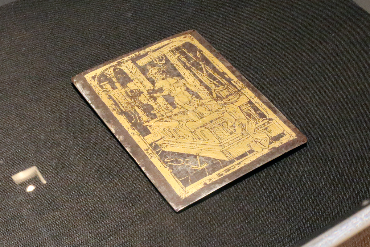 イスラエル・ファン・メッケネムに基づく《受難具を伴い墓の中に立つ悲しみの人》1500年頃 鉄、金鍍金、食刻 ゲルマン国立博物館 Germanisches Nationalmuseum,Nümberg,