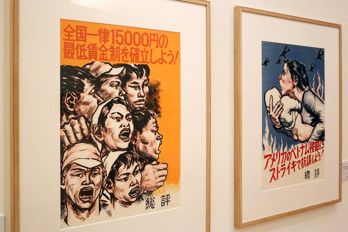 (左から)新海覚雄《全国一律15000円の最低賃金を確立しよう!》1965年頃 法政大学大原社会問題研究所蔵 / 新海覚雄《アメリカのベトナム侵略にストライキで抗議しよう!》1965年頃 法政大学大原社会問題研究所蔵