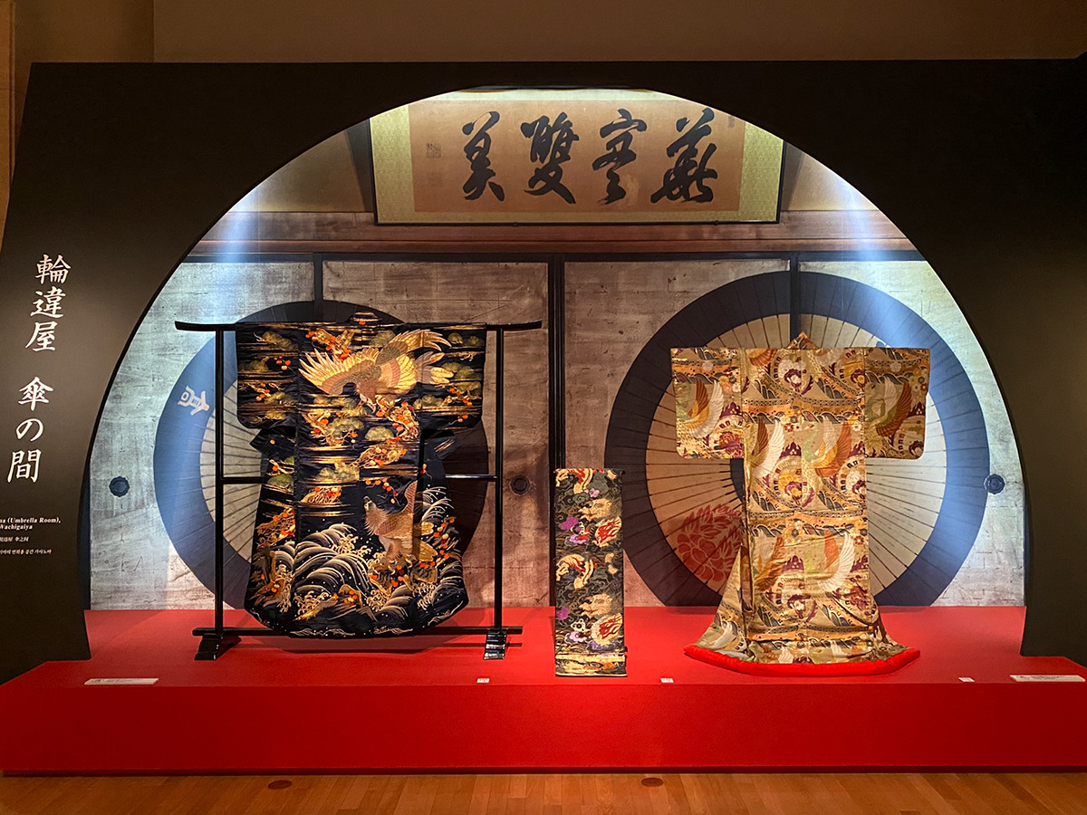 第一会場最後には、京都・島原の置屋、輪違屋に伝わった太夫の打掛。豪華な唐織の打掛は、西陣の近くだからこそあつらえる事ができます。輪違屋は現存しており、背景は「傘の間」の写真です。