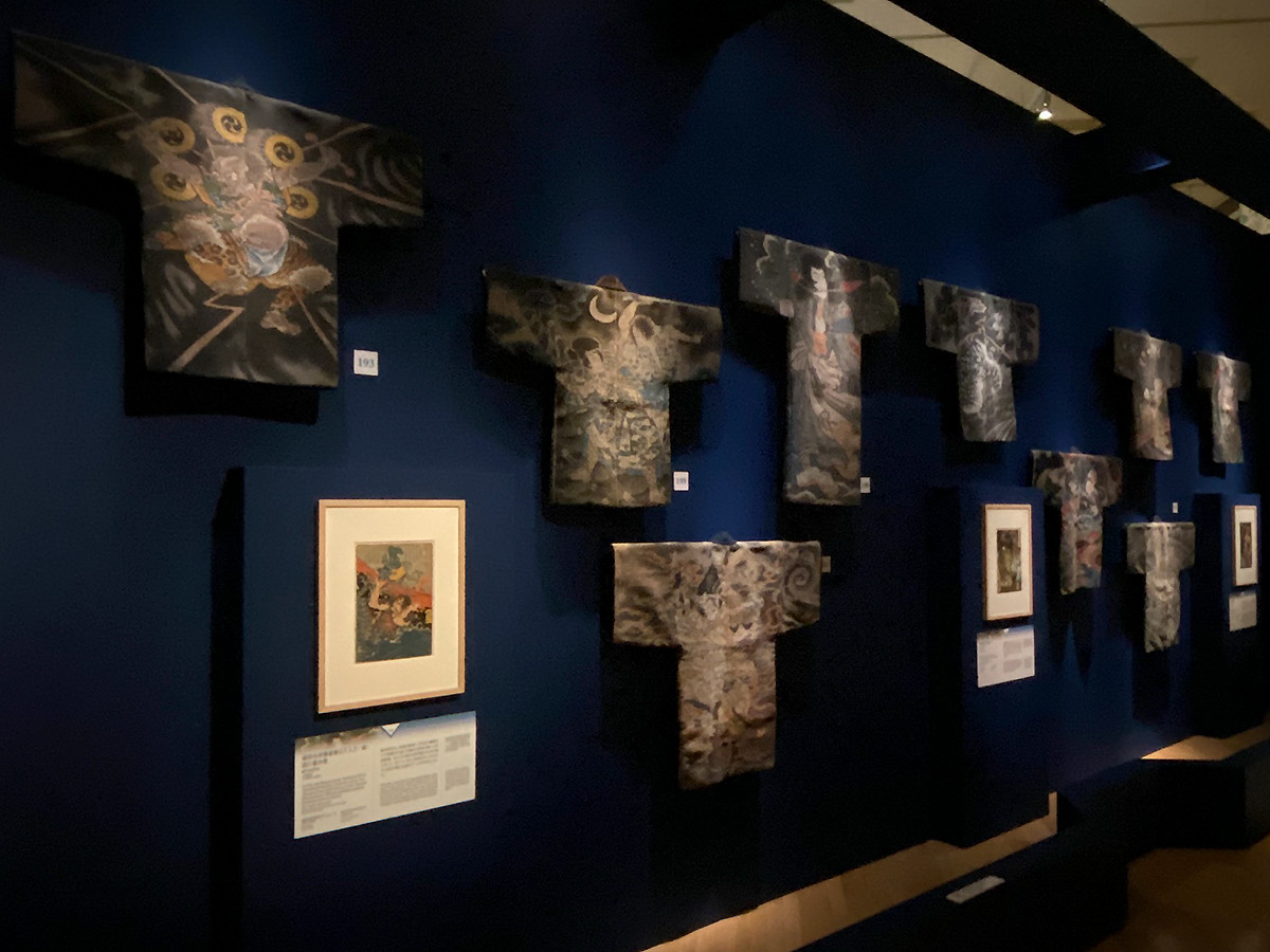 先に進むと粋な装いが登場。江戸時代に火消しを務めた鳶職は火消半纏の裏地に武者絵を表現し、その勇敢さを誇示しました。男らしい姿は浮世絵でも人気の題材になりました。