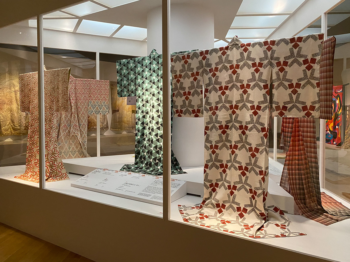 第4章「モダニズムきもの(明治・大正・昭和初期)」から、一気に会場は華やかになります。開国後、西欧から新しい文化が流入。服飾も男性は洋装化が進みますが、女性は第二次世界大戦前まではきものが一般的。きものの模様にも、ヨーロッパのモードが取り入れられます。