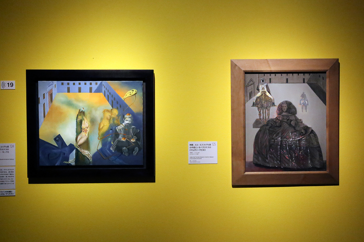 (左から)《無題、エル・エスコリアル宮の中庭にいるベラスケスの《セバスティアン・モーラ》》1982年 ガラ=サルバドール・ダリ財団 / 《無題、エル・エスコリアル宮の中庭にいるベラスケスの《マルガリータ王女》》1982年 ガラ=サルバドール・ダリ財団