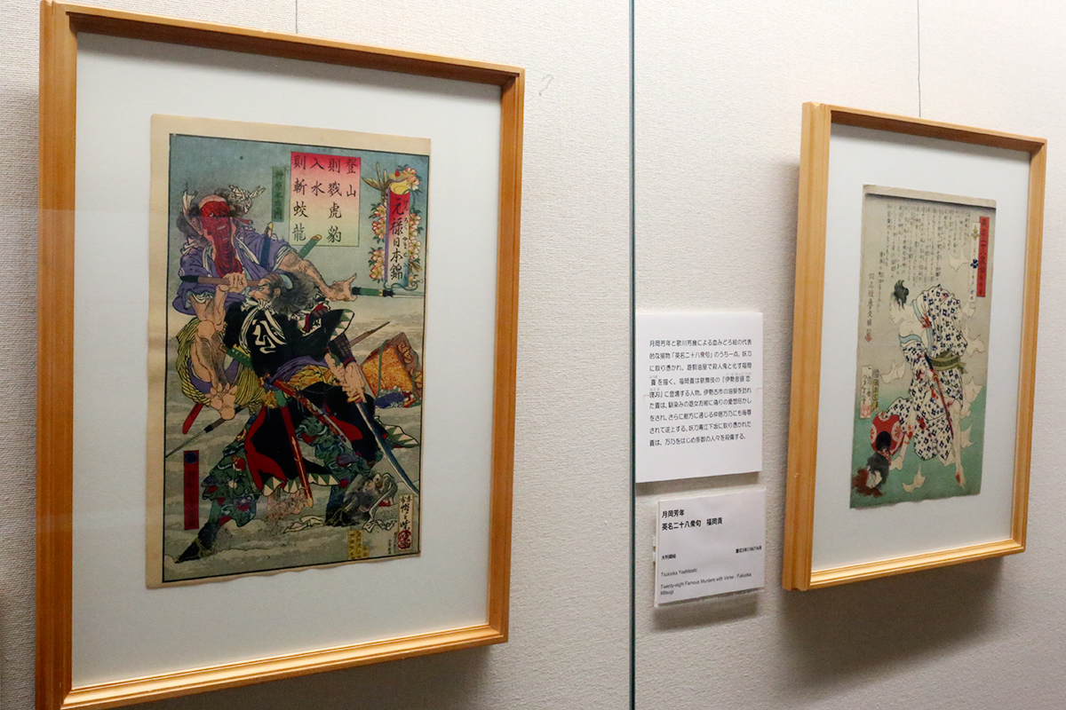 (左から)河鍋暁斎《元禄日本錦 み 村松三太夫高直》 / 月岡芳年《英名二十八衆句 福岡貢》