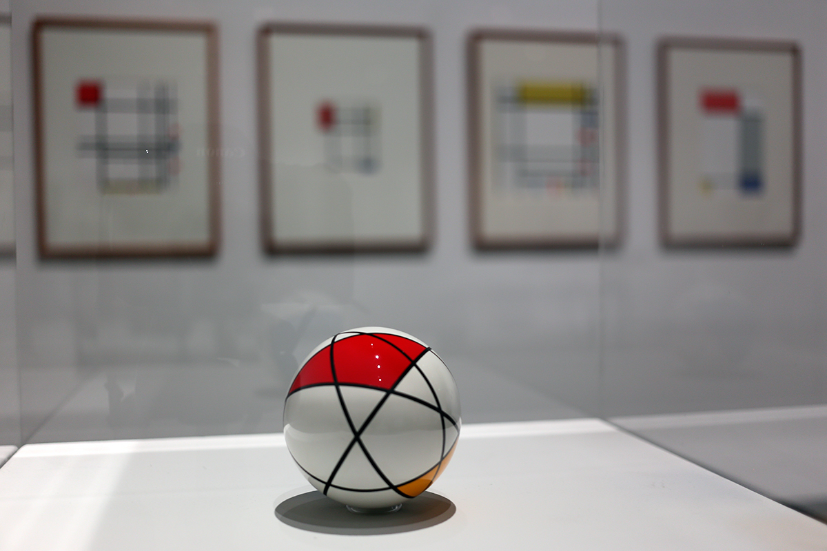 展覧会メインビジュアルになっているカラフルなボールは、ピート・モンドリアンの抽象画から。モンドリアンは水平垂直で画面を分割しましたが、岡崎さんは世界を球体に変形。配置によって多様な構図が生まれます。さらに、立方体に置き換えられたり、境界線を除き面だけが床面に並んだりと、別展開の作品もあります。