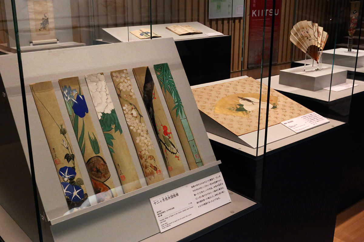 (左手前から)鈴木其一《十二ヶ月花木図短冊》 / 鈴木其一《鏡餅と鼠図扇面》鴻池合資会社資料室蔵 / 鈴木其一《・銀杏図扇・桜》 [全て展示期間終了]