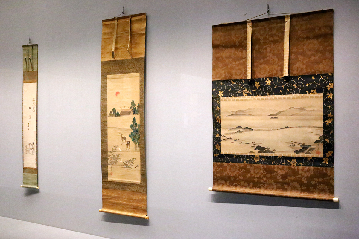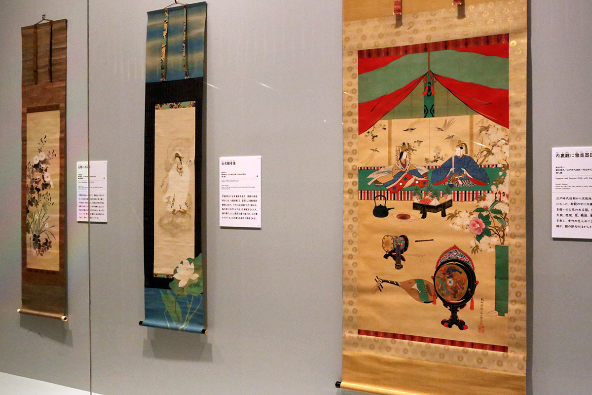 (左奥から)鈴木其一《白菊に水仙図》細見美術館蔵 / 鈴木其一《白衣観音像》個人蔵 / 鈴木其一《内裏雛に雅楽器図》個人蔵 [全て展示期間終了]