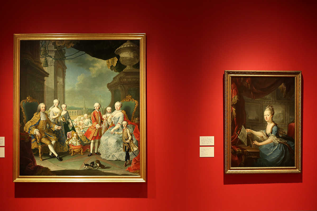 (左から)マルティン・ファン・マイテンス(子)《1755年の皇帝一家の肖像》ヴェルサイユ宮殿美術館 / フランツ・クサーヴァー・ヴァーゲンシェーン《チェンバロを弾くオーストリア皇女マリー・アントワネット》ウィーン美術史美術館