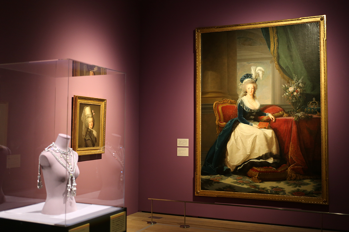 (左から)ピュルマ社(シャルル・オーギュスト・べメールとポール・バッサンジュの原作に基づく)《王妃の首飾りの複製》 / アドルフ・ユルリク・ヴァットムッレル《乗馬服を着たマリー・アントワネット》 / エリザベト=ルイーズ・ヴィジェ・ル・ブラン《白いペチコートに青いマントを羽織って座るマリー・アントワネット》 すべてヴェルサイユ宮殿美術館