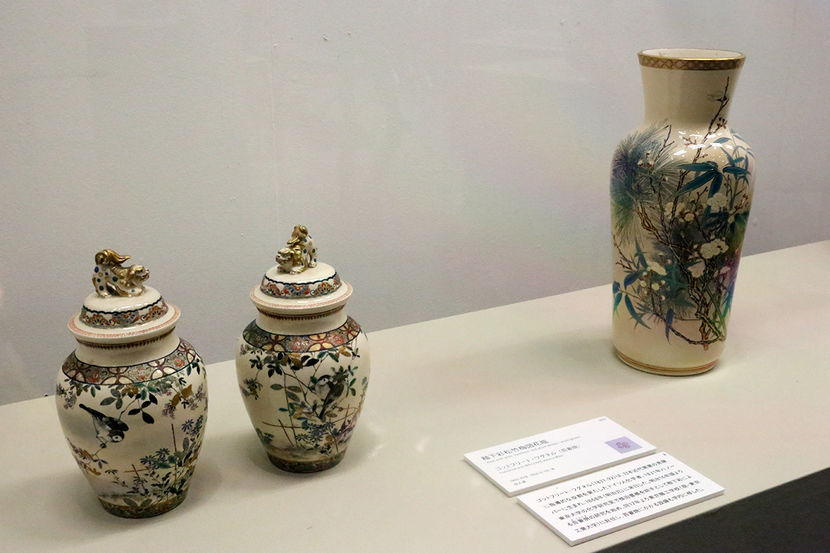 (左から)《上絵金彩染付草花図花瓶》アーレンス社 19世紀後期(明治時代前期) / 《釉下彩松竹梅図花瓶》ゴットフリート・ワグネル(吾妻焼) 1883-87(明治16-20)年頃