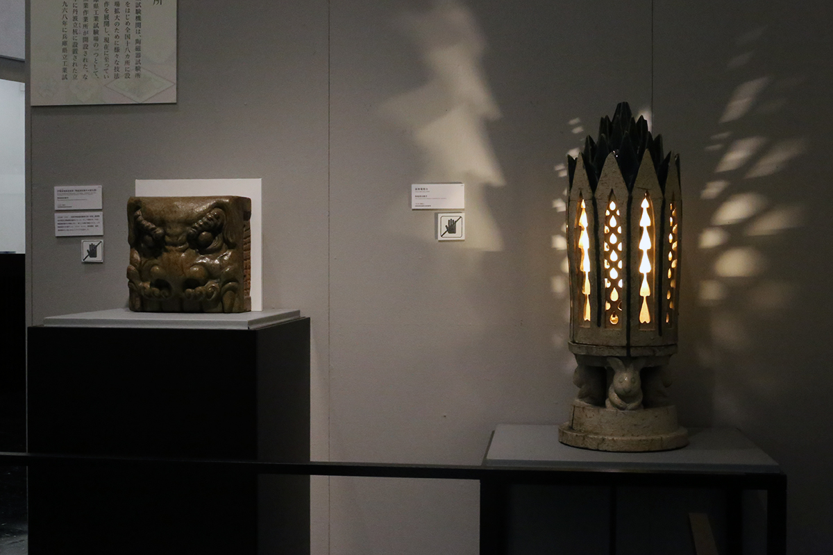 (左から)《伊羅保釉獣面装飾》(陶磁器試験所本館玄関) 陶磁器試験所 1928(昭和3)年 / 《装飾電燈台》陶磁器試験所 1927(昭和2)年 ともに滋賀県信楽窯業技術試験場