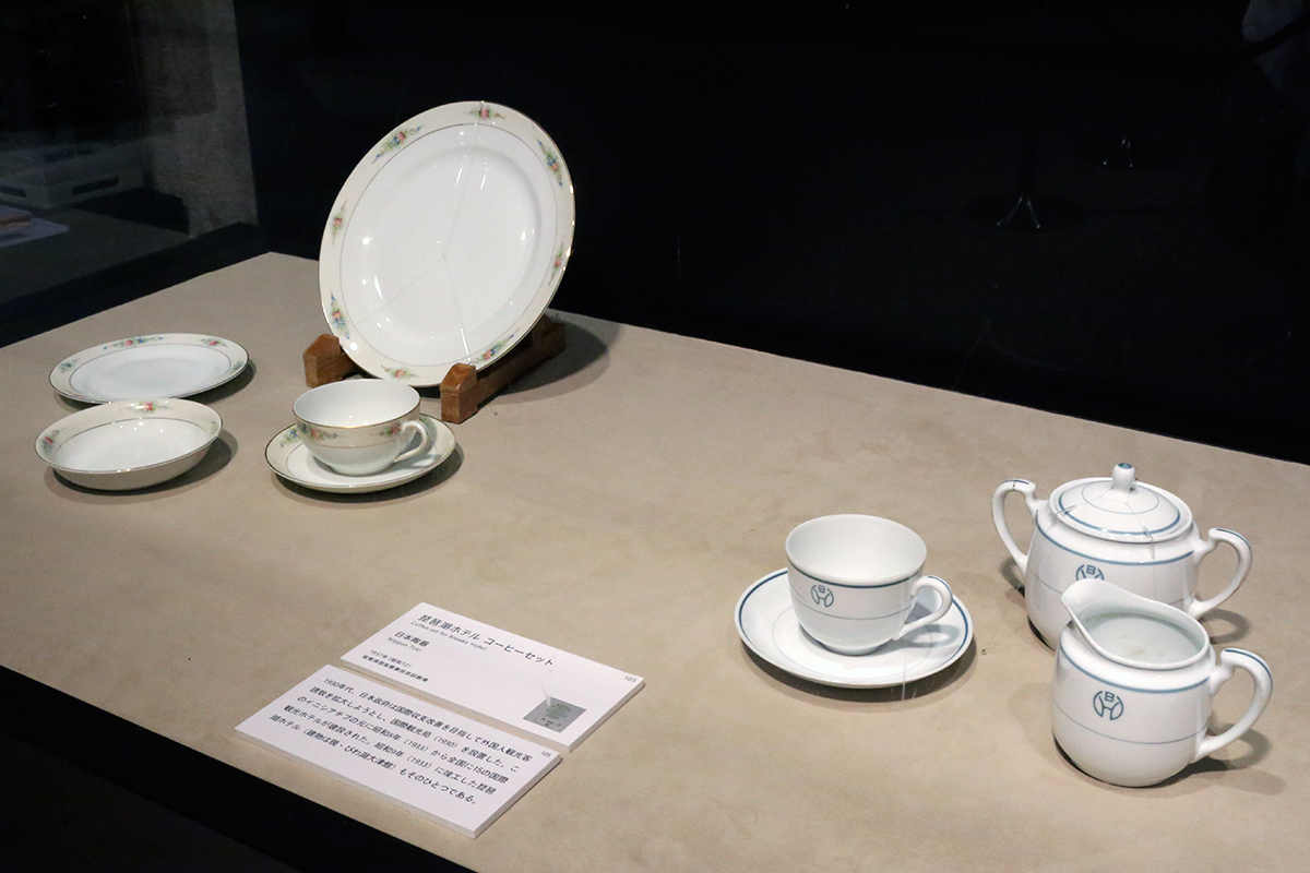 (左から)《ディナーセット「セダン」》日本陶器 1914-25(大正3-14)年頃 / 《琵琶湖ホテル コーヒーセット》日本陶器 1937(昭和12)年 滋賀県信楽窯業技術試験場