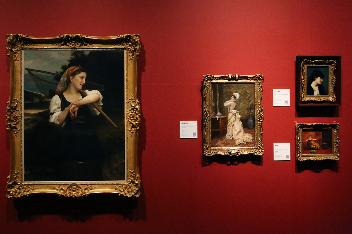 (左)ウィリアム・アドルフ・ブーグロー《漁師の娘》 / (中)ジュール・ジェーム・ルージュロン《鏡の前の装い》 / (右上)ジャン=ジャック・エンネル《少女の横顔》 / (右下)ジョルジュ・クロエガート《婦人像》