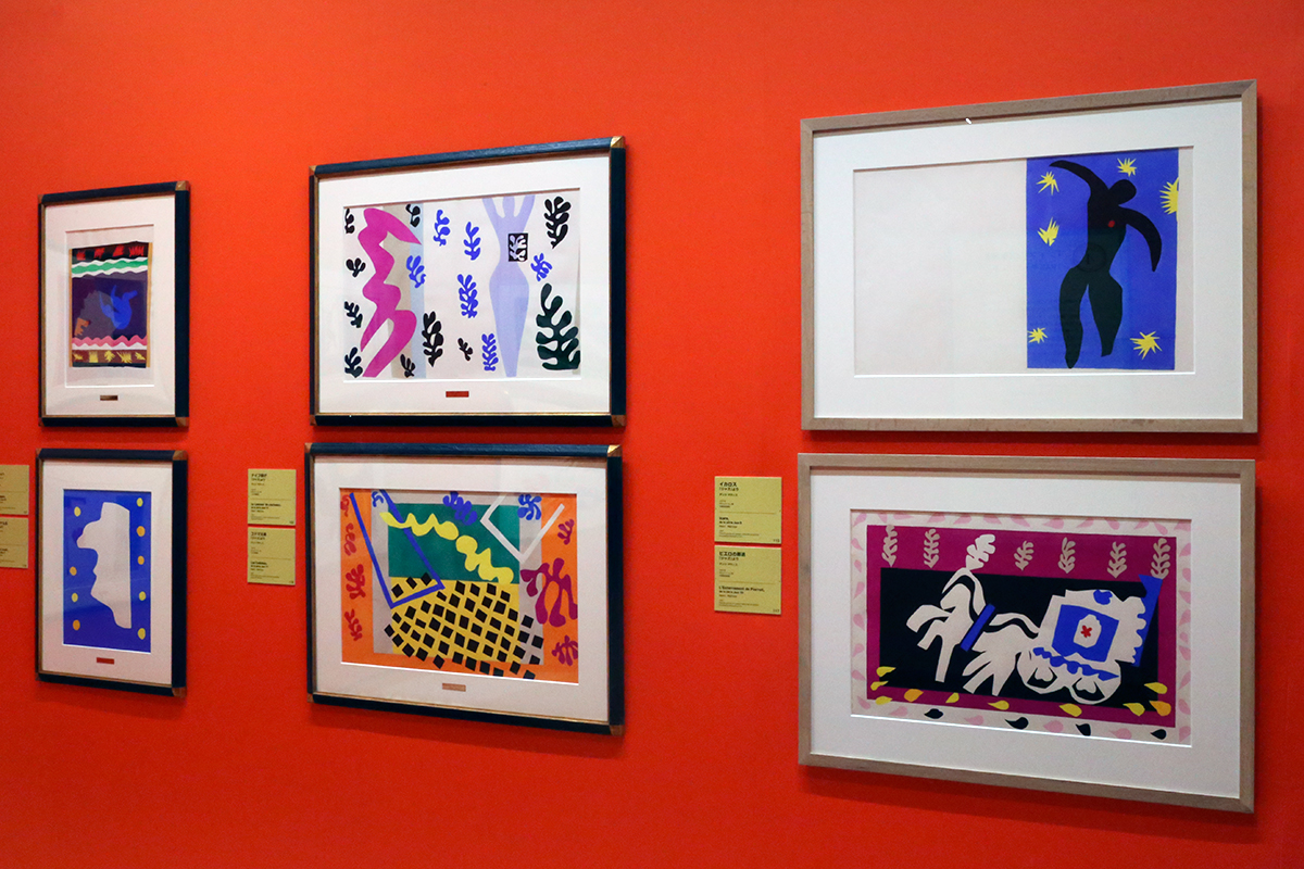 (左上から時計回りで)アンリ・マティス《そり》 / アンリ・マティス《ナイフ投げ》 / アンリ・マティス《イカロス》 / アンリ・マティス《ピエロの葬送》 / アンリ・マティス《コドマ兄弟》 / アンリ・マティス《ロワイヤル氏》 すべて『ジャズより』 うらわ美術館