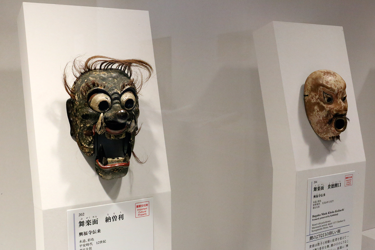 (左から)重要文化財《舞楽面 納曽利》春日大社 / 重要文化財《舞楽面 貴徳鯉口》春日大社