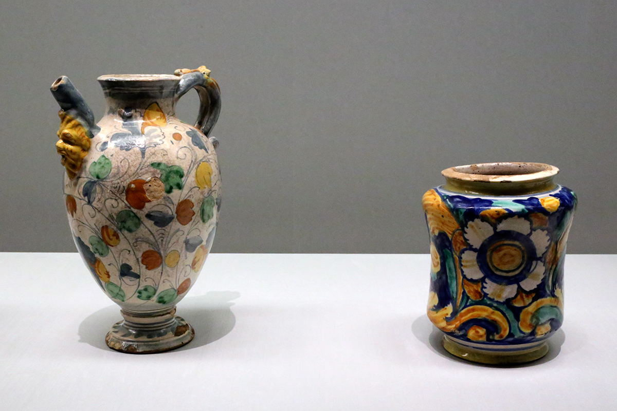 《色絵唐草文水注》イタリア 16世紀 / 《色絵花卉文アルバレロ》イタリア 16世紀
