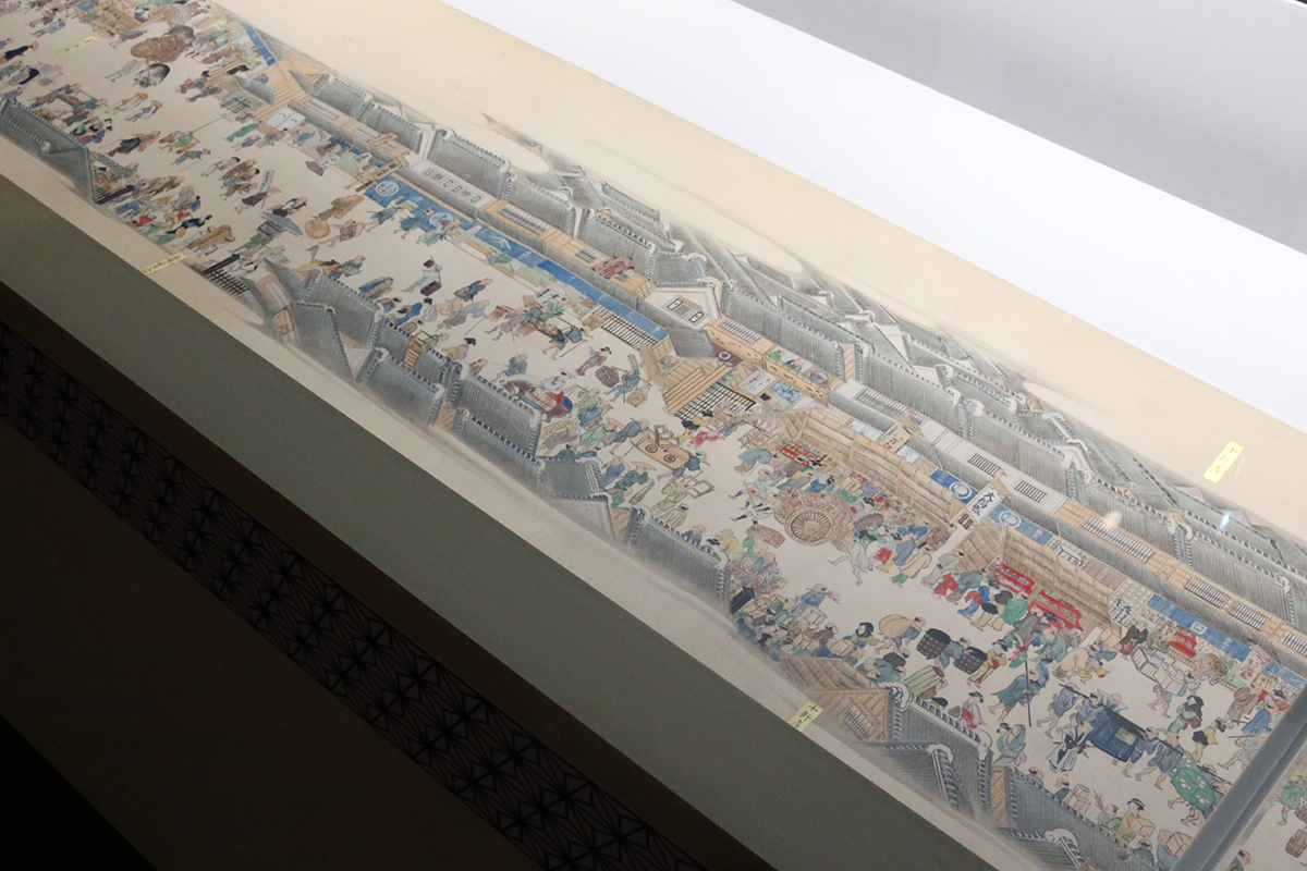 一方の《熈代勝覧》は、1805年頃の江戸の姿。神田今川橋から日本橋まで、多くの店舗と人びとで賑わうメインストリートが描かれました。こちらはベルリン国立アジア美術館蔵、日本での公開は11年ぶりです。