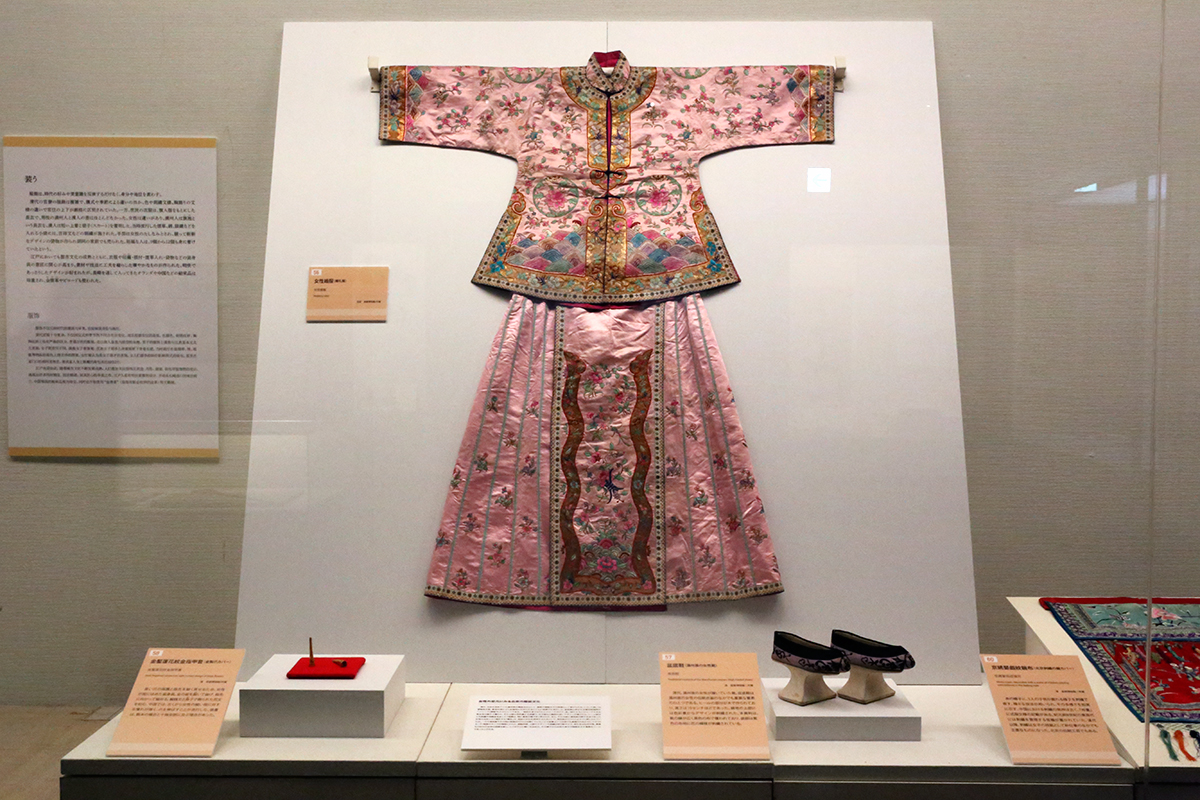 (手前左から)《金鏨蓮花紋金指甲套(金製爪カバー)》清 / 《盆底鞋(満州族の女性靴)》清 / (奥)《女性婚服(婚礼服)》民国 すべて首都博物館
