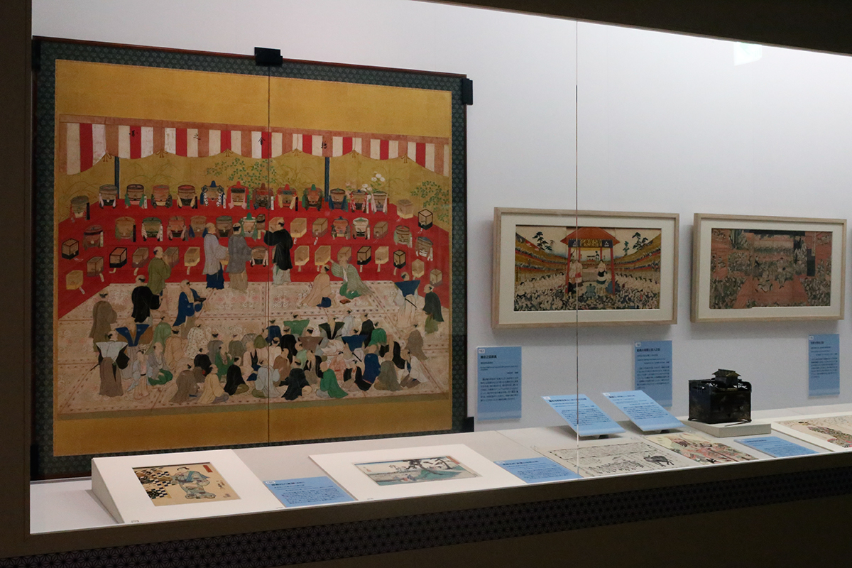 (壁側 左から)《鶉会之図屛風》18世紀後半 / 《勧進大相撲土俵入之図》歌川国貞(初代)画 弘化年間(1844-48年) / 《芝居大繁昌之図》歌川豊国・画 1815-42年(文化12-天保13) すべて江戸東京博物館
