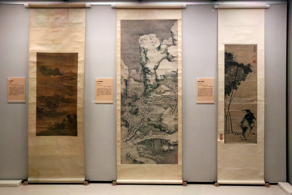 (左から)《山水図軸》王翬・画 康煕年間(1662-1722年) / 《渓山雪霽図軸》李世倬・画 清 / 《墨筆花鳥図軸》朱耷(八大山人)・画 清 すべて首都博物館
