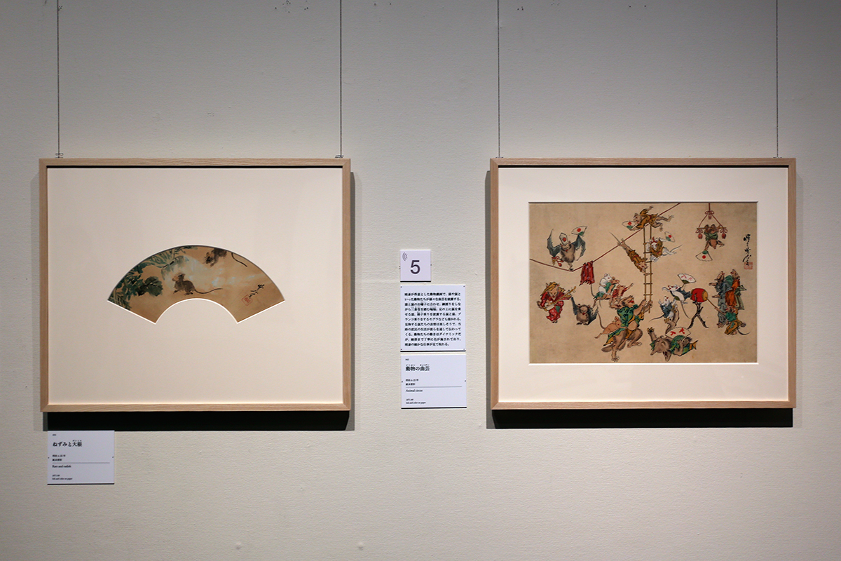 (左から)河鍋暁斎《ねずみと大根》明治4-22(1871-89)年 / 河鍋暁斎《動物の曲芸》明治4-22(1871-89)年