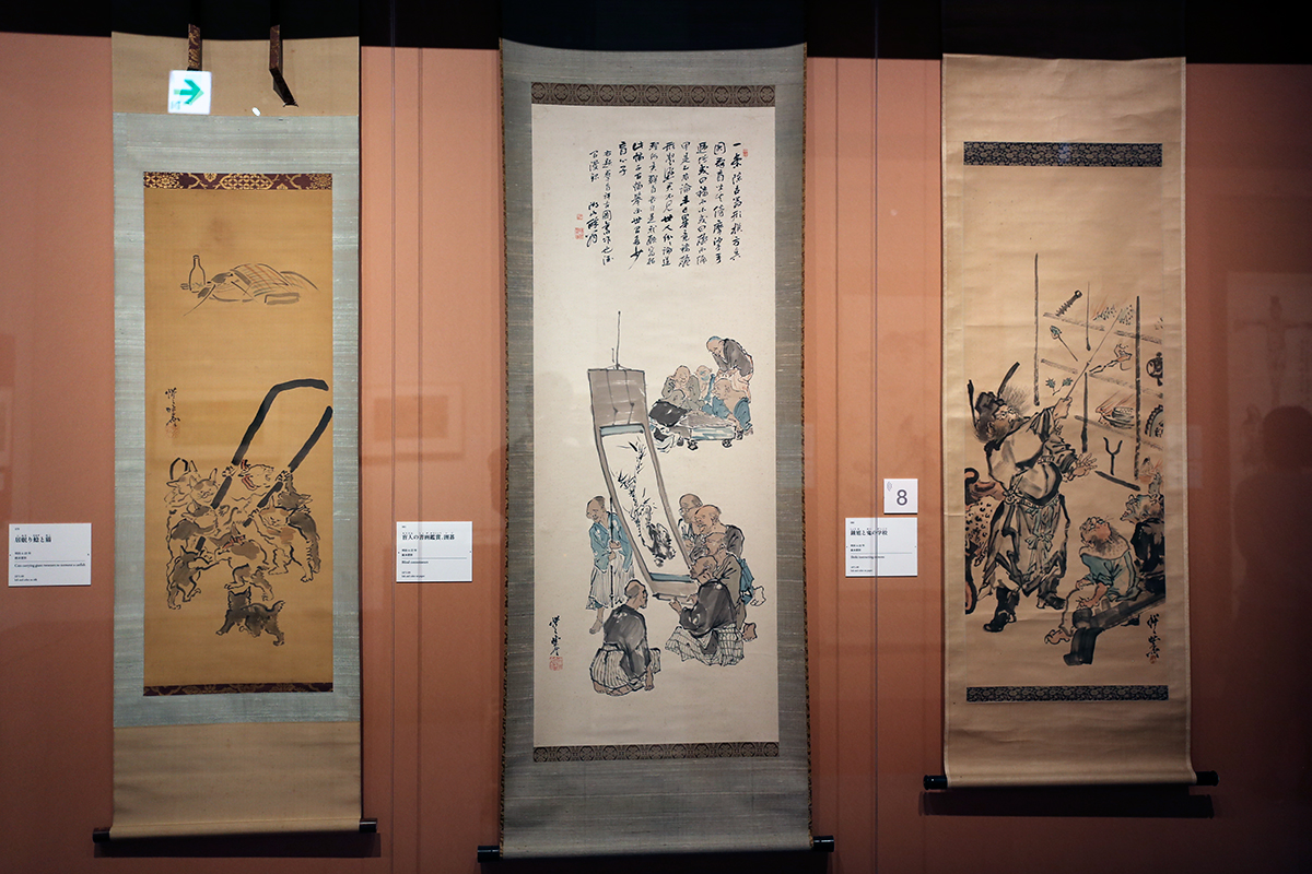 (左から)河鍋暁斎《居眠り鯰と猫》明治4-22(1871-89)年 / 河鍋暁斎《盲人の書画鑑賞、囲碁》明治4-22(1871-89)年 / 河鍋暁斎《鍾馗と鬼の学校》明治4-22(1871-89)年