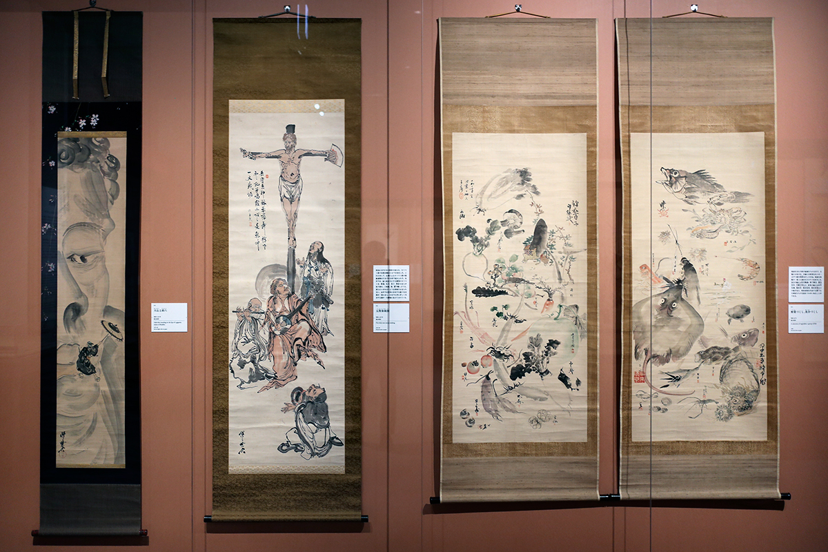 (左から)河鍋暁斎《大仏と助六》明治4-22(1871-89)年 / 河鍋暁斎《五聖奏楽図》明治4-22(1871-89)年 / 河鍋暁斎《野菜づくし、魚介づくし》明治18(1885)年