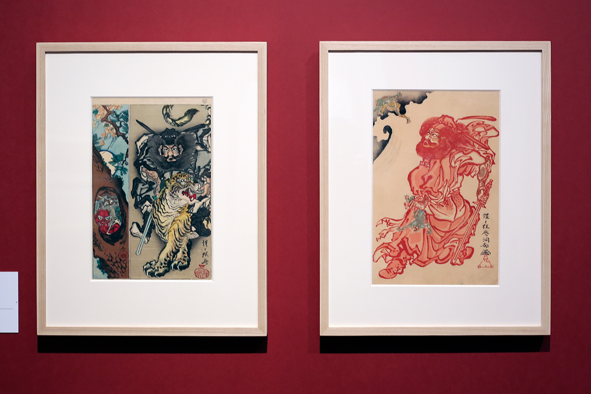 (左から)河鍋暁斎《貼交絵 虎に乗る鍾馗/隠れる鬼》元治元年(1864)年 / 河鍋暁斎《朱鍾馗と鬼》明治3(1870)年以前