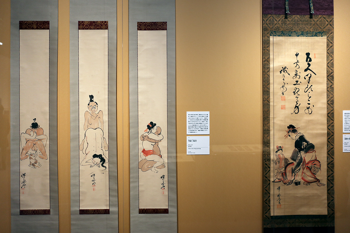 (左から)河鍋暁斎《笑絵三幅対》明治4-22(1871-89)年 / 河鍋暁斎《達磨の股くぐり》明治4-22(1871-89)年